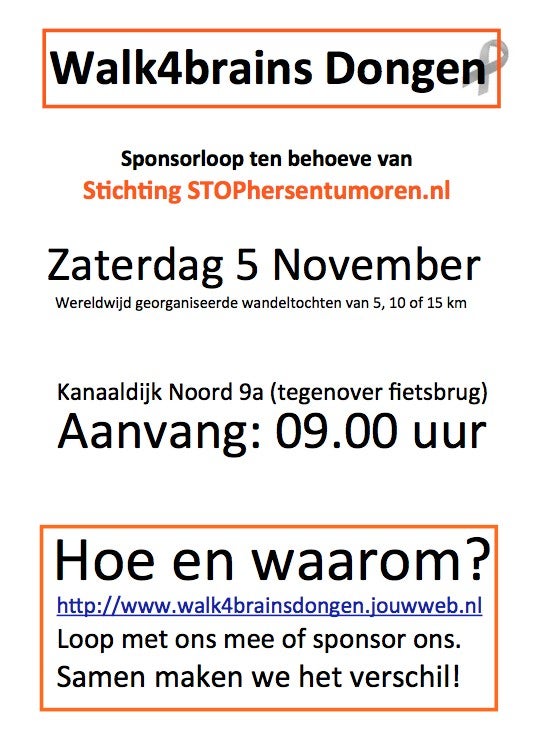 Op zaterdag 5 november hebben wij voor de tweede maal een walk4brains in Dongen georganiseerd. Wat een succes! We willen op deze manier iedereen bedanken die deze dag gelopen, gesponserd of geweldig geholpen hebben. Zonder jullie allemaal was dit niet zo gelukt. Wat fijn dat we elkaar hebben mogen ontmoeten en met elkaar hebben mogen delen. Wij, Team van der Veeken, kijken met een tevreden gevoel terug op deze mooie, zonnige dag. Het weer hadden we ook nog mee!